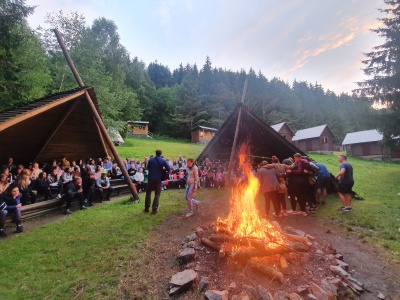 Dnešní den prvního oddílu byl plný her a soutěží jako veverčí ocásky, popeláři, štafety… Nejvíce holky byly nadšené u večerního táboráku, kde se sešla tlupa pohádkových bytostí. Všechny byly velice smutné. Maxipes Fík ztratil Áju, Křemílek a Vochomůrka přišli o povidla a Žofka Orangutánová marně hledala zatoulané bendžo. A to je jen hrstka nešťastných tváří. Holky ulehaly do postýlek s myšlenkou na nešťastného bezvousého Krakonoše, jak mu asi zítra pomůžou. A radost jim nejen udělalo téma letošní hry, ale i výborné řízky k obědu a ještě lepší špagety k večeři.